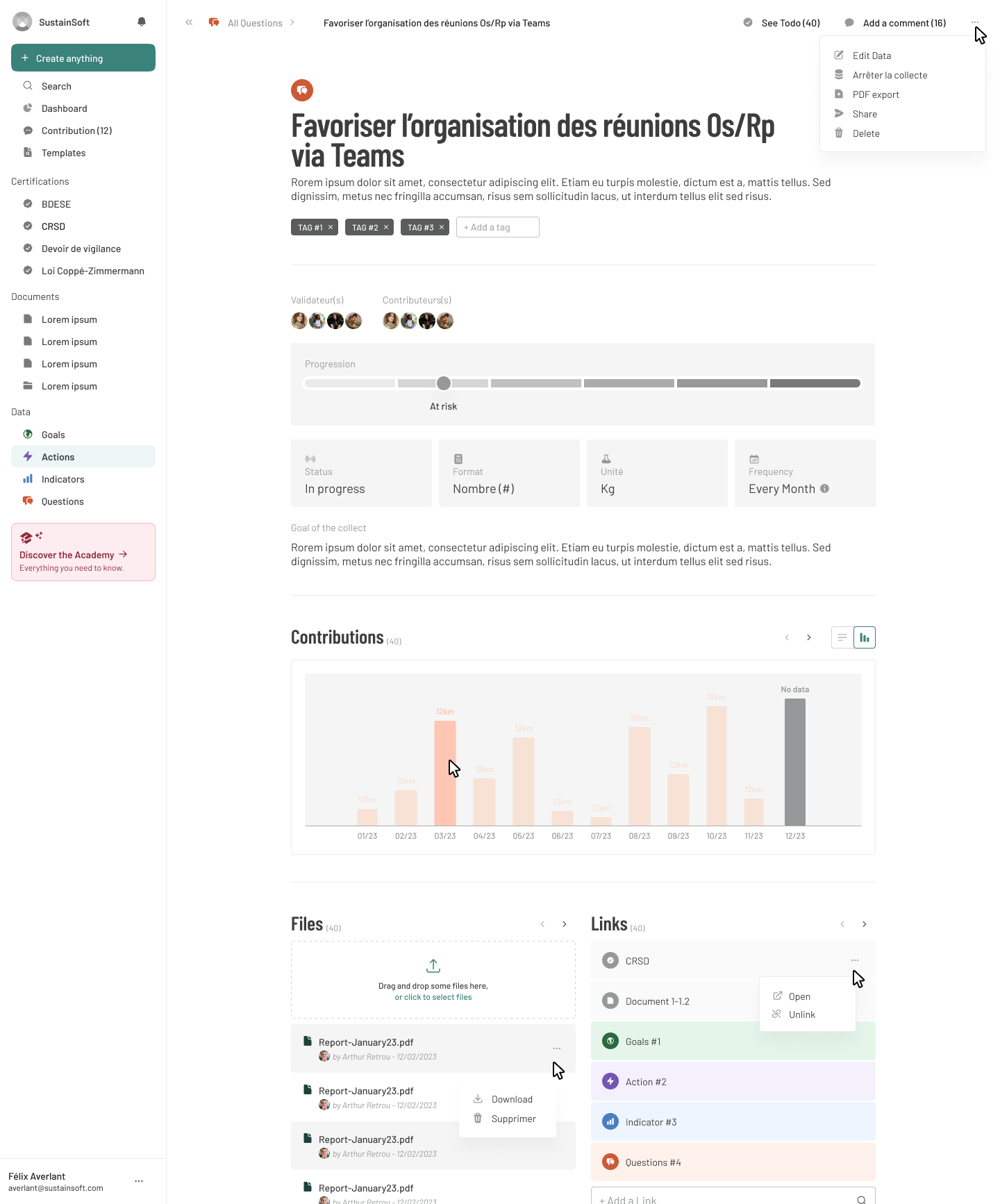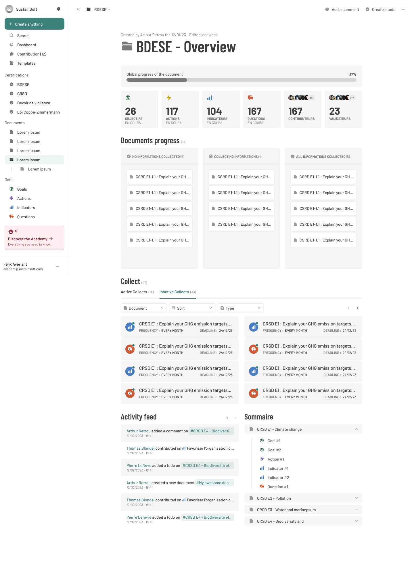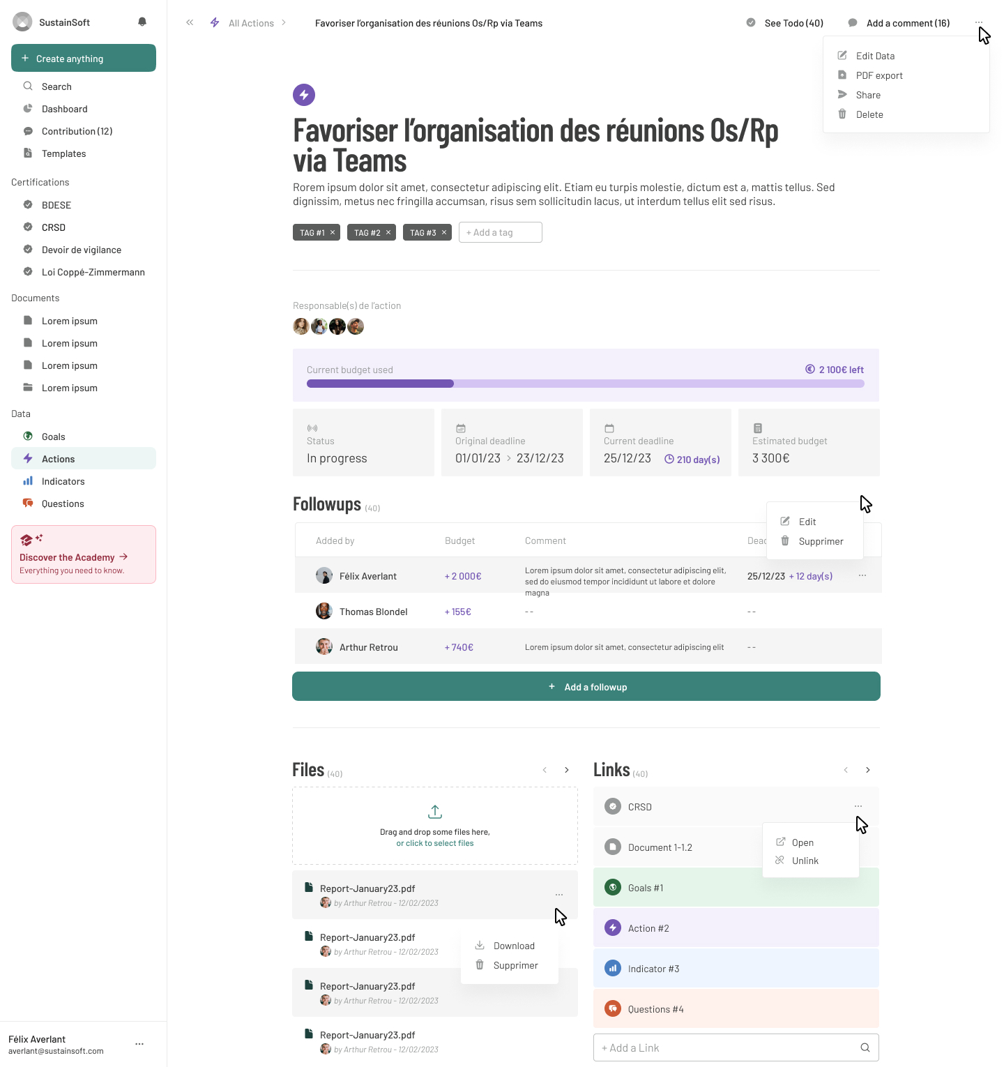 Pour présenter rapidement le produit, SustainSoft est un outil de comptabilité extra-financière pour les entreprises. L’objectif était de créer un outil permettant de gérer les écritures extra-financières afin de publier des états financiers transparents.