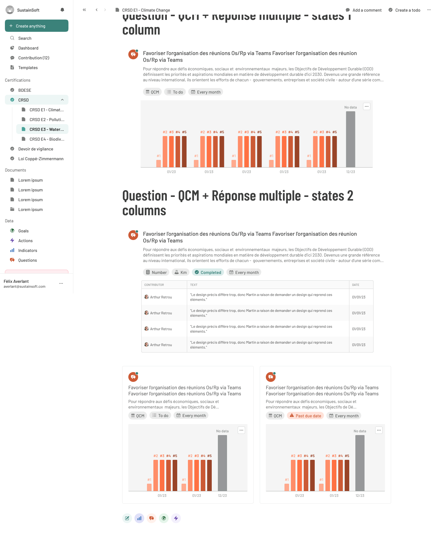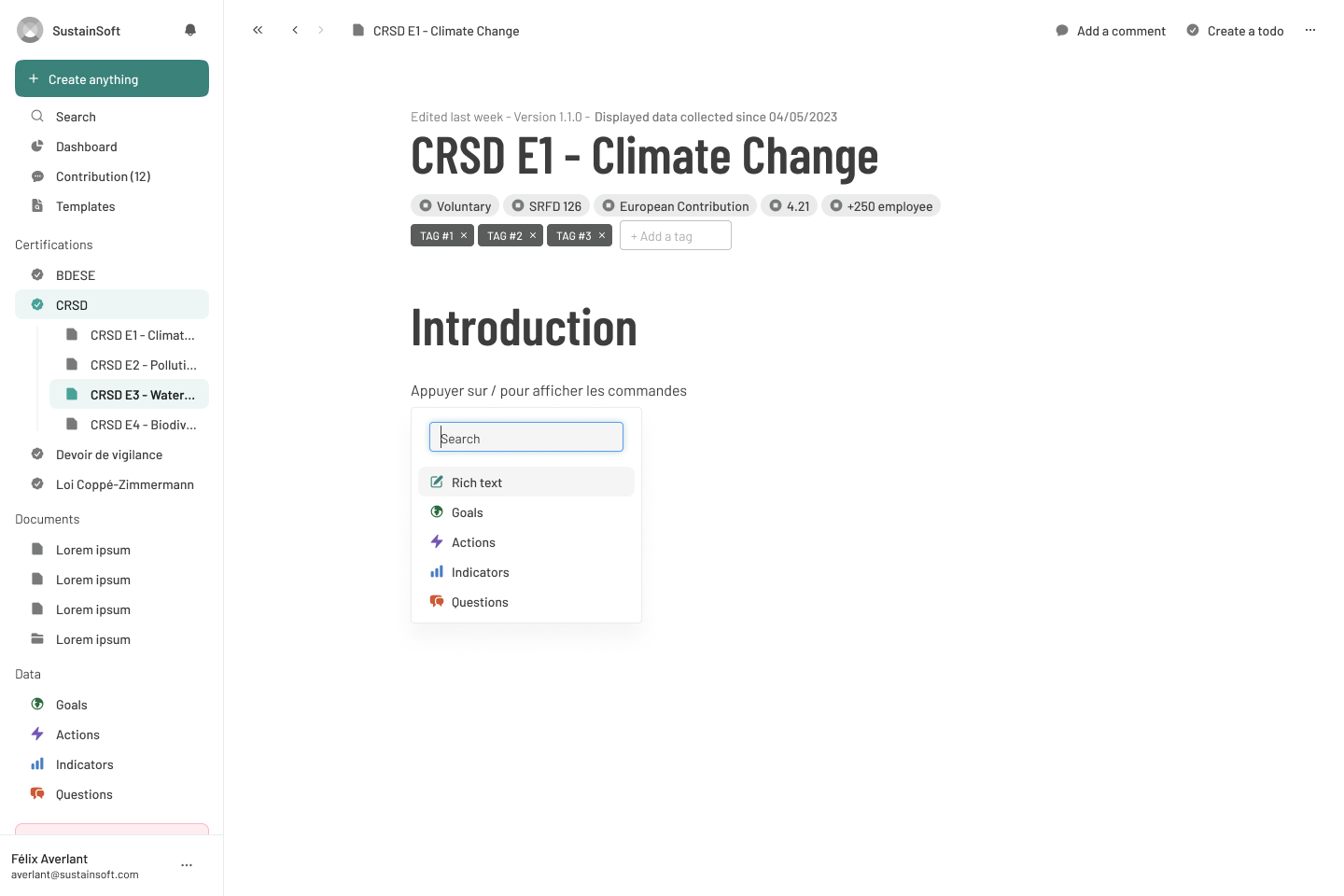J'ai voulu l'interface comme étant une version spécialisée 'Notion like' afin de gérer le brouillard quant à notre business model au lancement du projet. Le principe de blocks, d'éléments et de documents permettait d'anticiper et tester plusieurs frameworks / certifications sans avoir à redévelopper à chaque fois de nouvelles fonctionnalités.